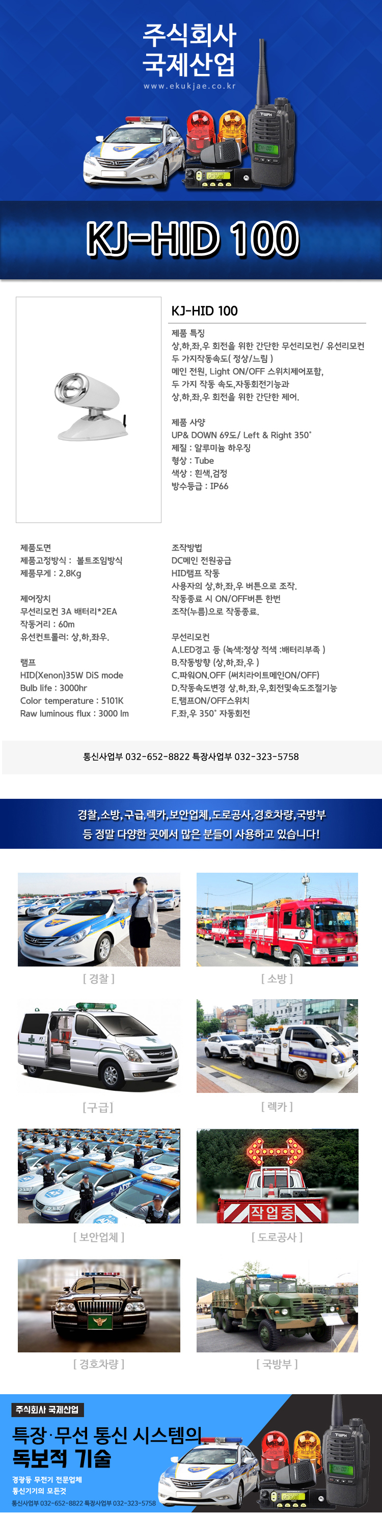 KJ-HID 100 서울,구리,남양주,하남,고양,의정부,양주,포천,동두천,김포,광명,인천,시흥,안산,의왕,성남,광주,수원,화성,용인,오산,평택,양평,이천,여주,원주,횡성,홍천,가평,춘천,화천,양구,인제,강원도,경기도,강릉,양양,평창,정선,영월,제천,고성,속초,강릉,동해,삼척,태백,단양,봉화,울진,영양,영주,예천,천안,진천,음성,충주,괴산,청주,아산,당진,태안,서산,보령,공주,세종,대전,계롱,논산,금삭,영동,서천,상주,문경,구미,김천,의성,안동,영광,고창,나주,목포,해남,여수,순천,통영,진주,창원,김해,부산,울산,경주,포항,대구,달성,LED,경광등,싸인보드,앰프스피커,특장,고소작업대,써치라이트,무전기,무선중계기,비상등,국제산업,주식회사국제산업,전광판,싸이렌앰프,안테나,멀티충전기,무전기충전기,무전기악세사리,무전기마이크,미니경광등,특수경광등,경찰경광등,경찰싸인보드,소방,국방,병원,경호,산악,등산,행사,쏠라경광등,태양열경광등.도로경광등.작업등,탐조등,유리부착경광등.리프트경광등,모토로라무전기